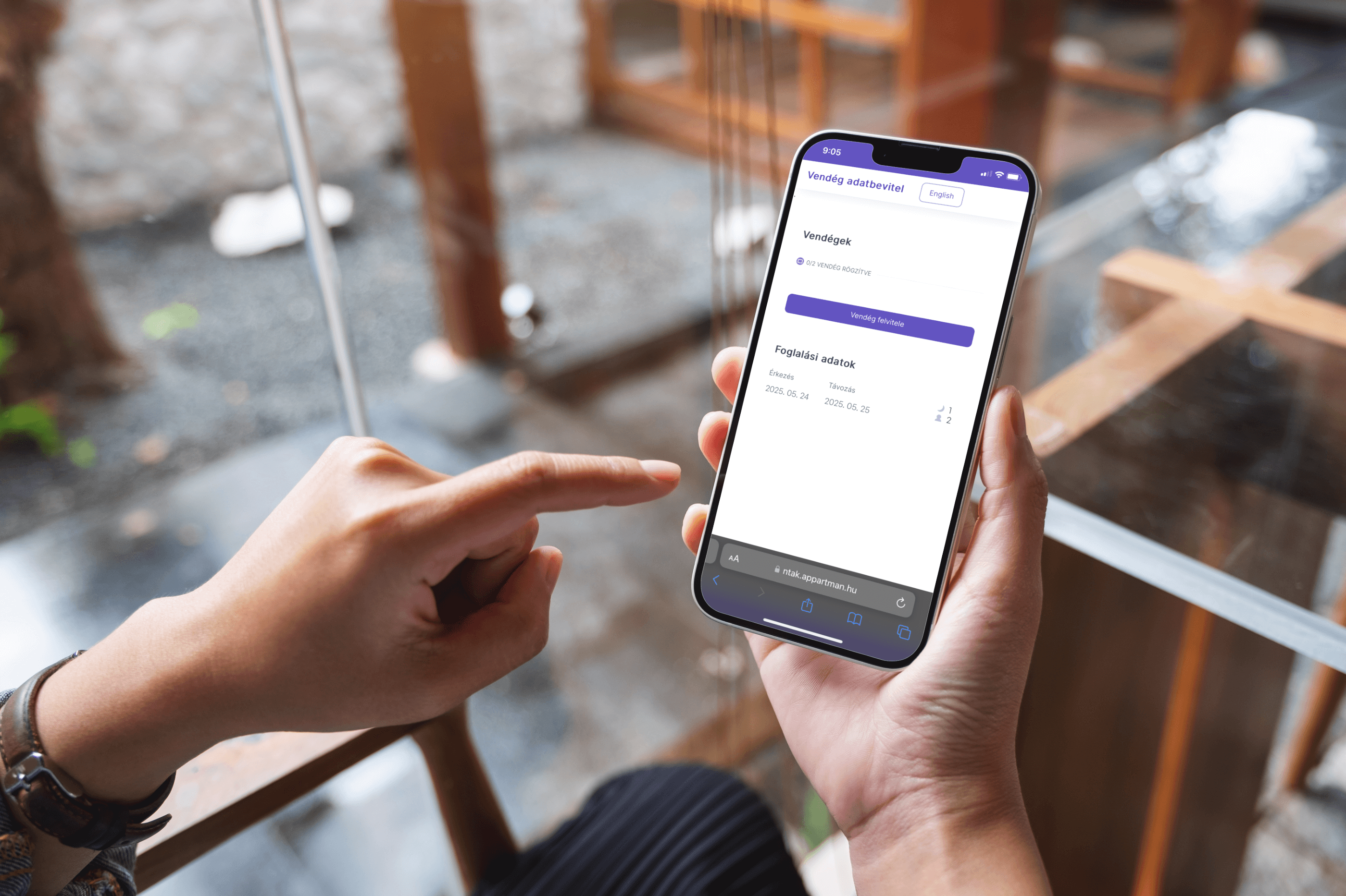 A vendégek egy emailben kapott linken - app letöltése nélkül - tudják megadni okmányadataikat az adott foglaláshoz. Csoportos foglalás esetén a link biztonságosan megosztható.